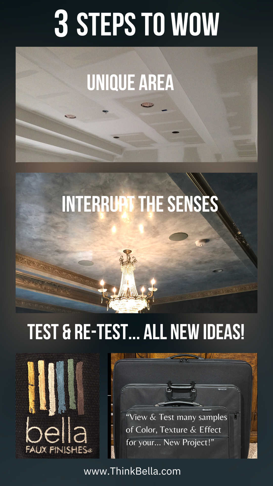(2) Bella Helps You Solve Problems! – Creating Dramatic Interior Design is not easy. When Bella is invited to projects, we bring along a “Very Large Portfolio of Artistic Finishes” from around the world. With 17 years experience in the Creation and challenging Application of these Historic Finishes.